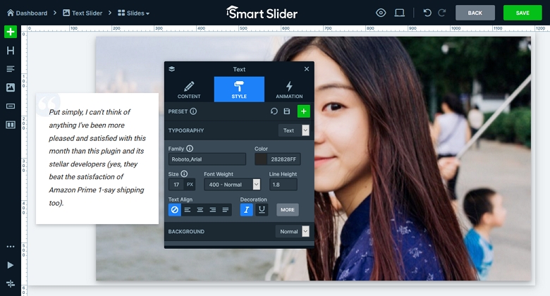 I gotta say, making design changes to text and images is so easy with Smart Slider. It was much quicker to access and edit styling options compared to Slider Revolution. Next, I added a heading layer for the name and another image layer for the logo: